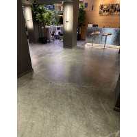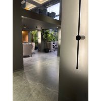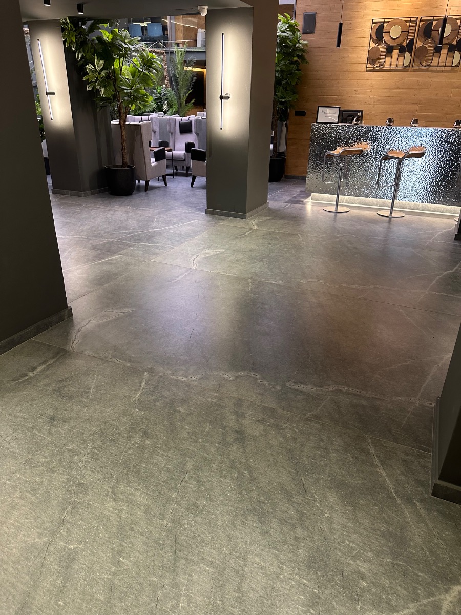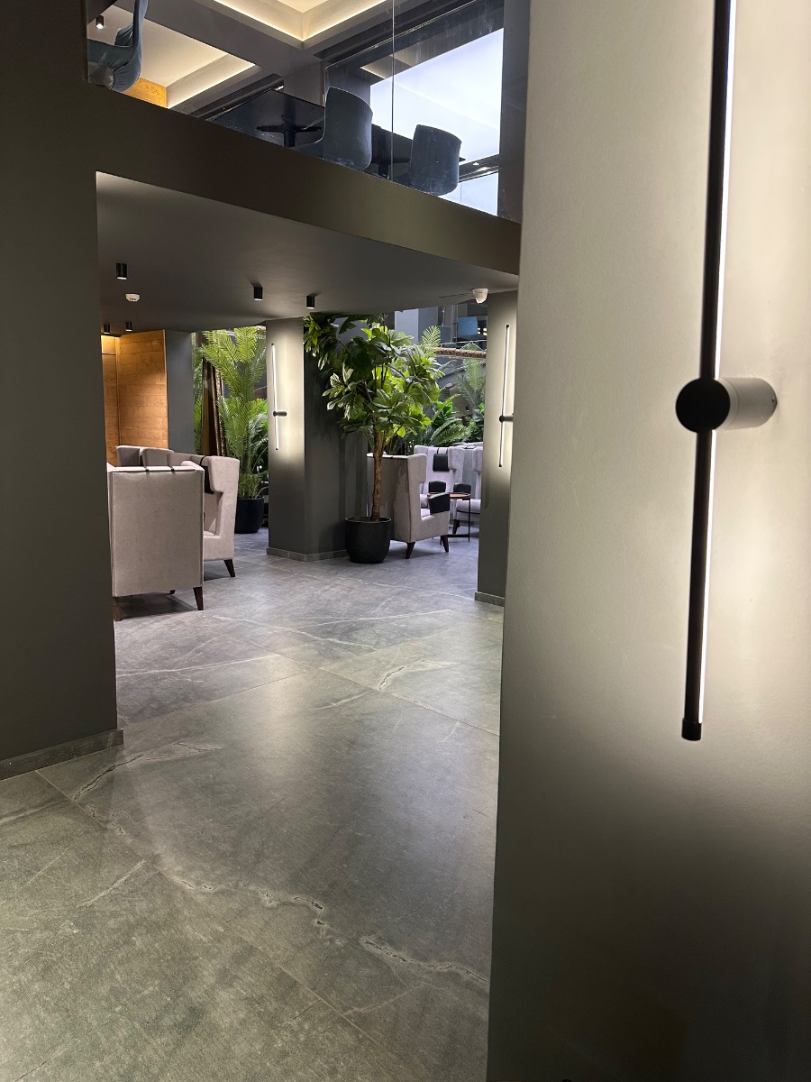 Α.RECEPTION: Ο χώρος της υποδοχής δεν είναι απλώς ένα πέρασμα. Είναι το πρώτο σημείο επαφής με τον επισκέπτη, το σημείο όπου γεννιέται η εντύπωση και ξεκινά η εμπειρία. Η επιλογή των πλακιδίων, καθορίζει την ατμόσφαιρα που θα ακολουθήσει ο επισκέπτης σε κάθε του βήμα. Γιαυτό και επιλέχθηκαν πλακάκια τύπου slabs (διαστάσεων 1,60 Χ 3,20μ) της Ιnfinity και πιο συγκεκριμένα το γρανιτοπλακάκι XL Atlantis Grey, σε ύφος μαρμάρου με ματ υφή. Τα πλακάκια αυτών των διαστάσεων προσφέρουν σημαντικά πλεονεκτήματα όπως: γρήγορη και απρόσκοπτη τοποθέτηση, ευκολία καθαρισμού (λιγότεροι αρμοί) αλλά και κορυφαία αισθητική, καθώς τα slabs προσφέρουν μία εντυπωσιακή, ενιαία επιφάνεια η οποία αναδεικνύει τον χώρο και τον κάνει να φαίνεται μεγαλύτερος.