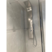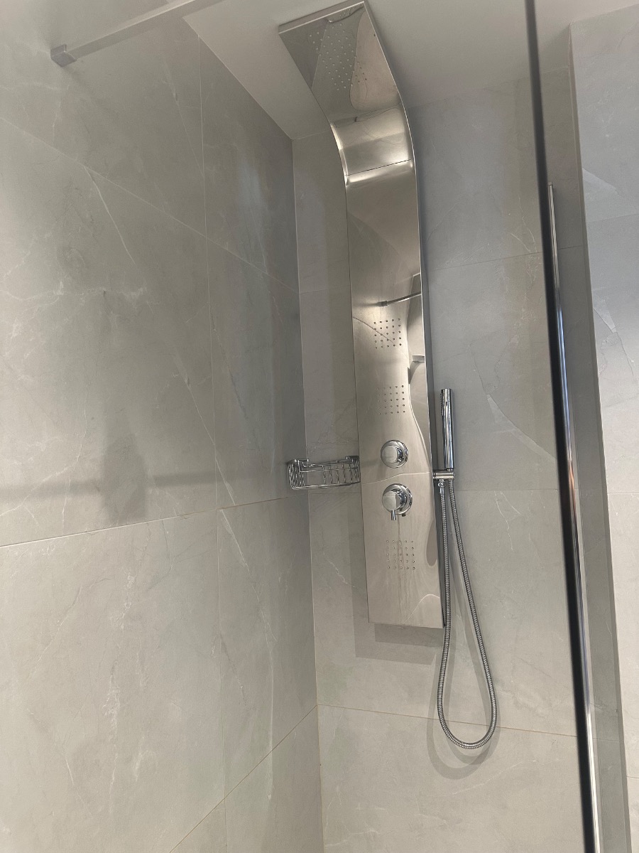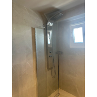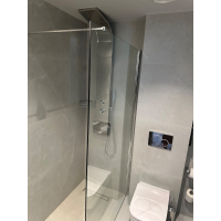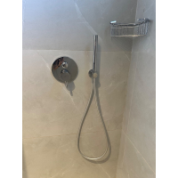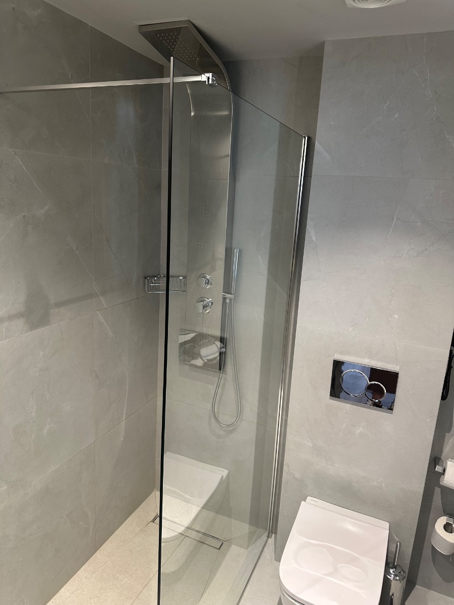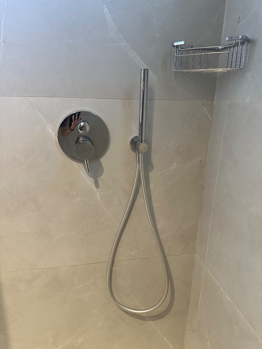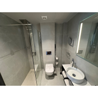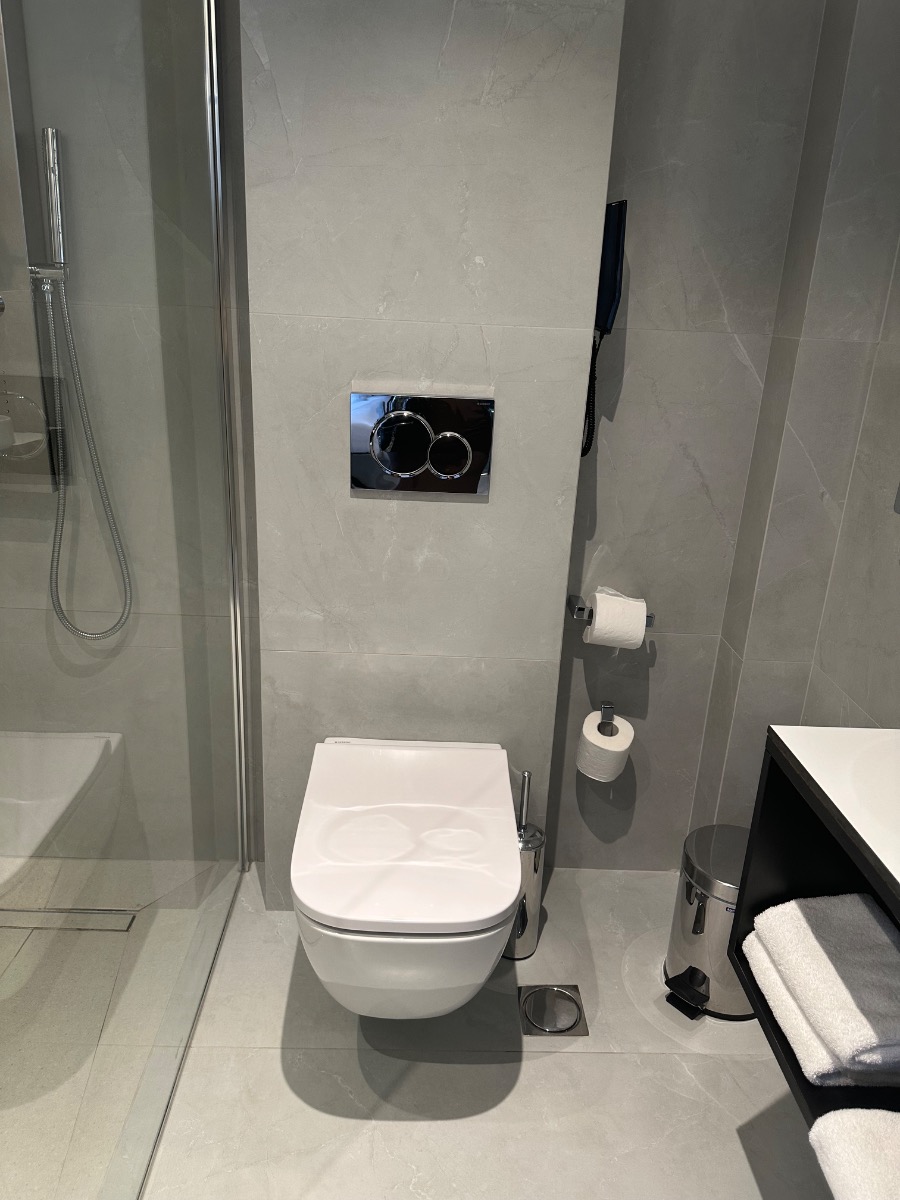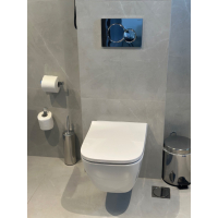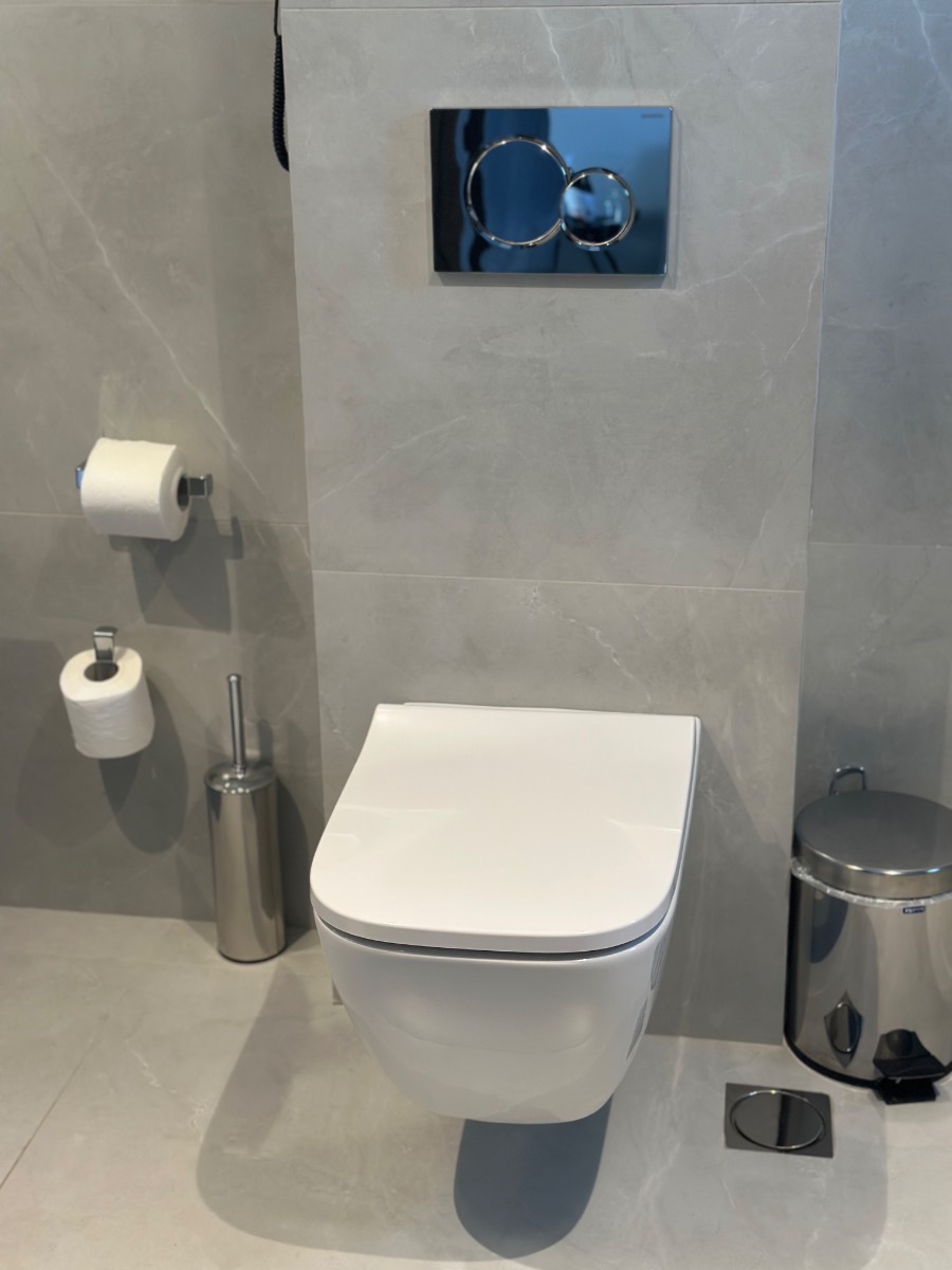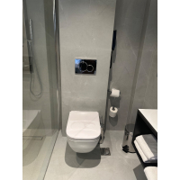 Σε ότι αφορά τις λεκάνες επιλέχθηκε η κρεμαστή Smyle Square 500.683.00.2 με καπάκι soft close της Ελβετικής Geberit σε συνδυασμό με το Duofix Sigma 111.950.00.6 εντοιχισμένο καζανάκι της ίδιας εταιρείας (Geberit) - η ενδεδειγμένη επιλογή για τοποθέτηση με τοίχους από γυψοσανίδα (12cm) χάρις και το ειδικό κουτί επισκευής του - για μακροχρόνια αξιοπιστία- καθώς δεν απαιτείται το γκρέμισμα της γυψοσανίδας για την επισκευή του.