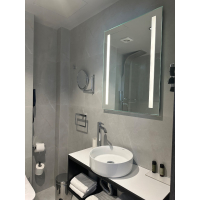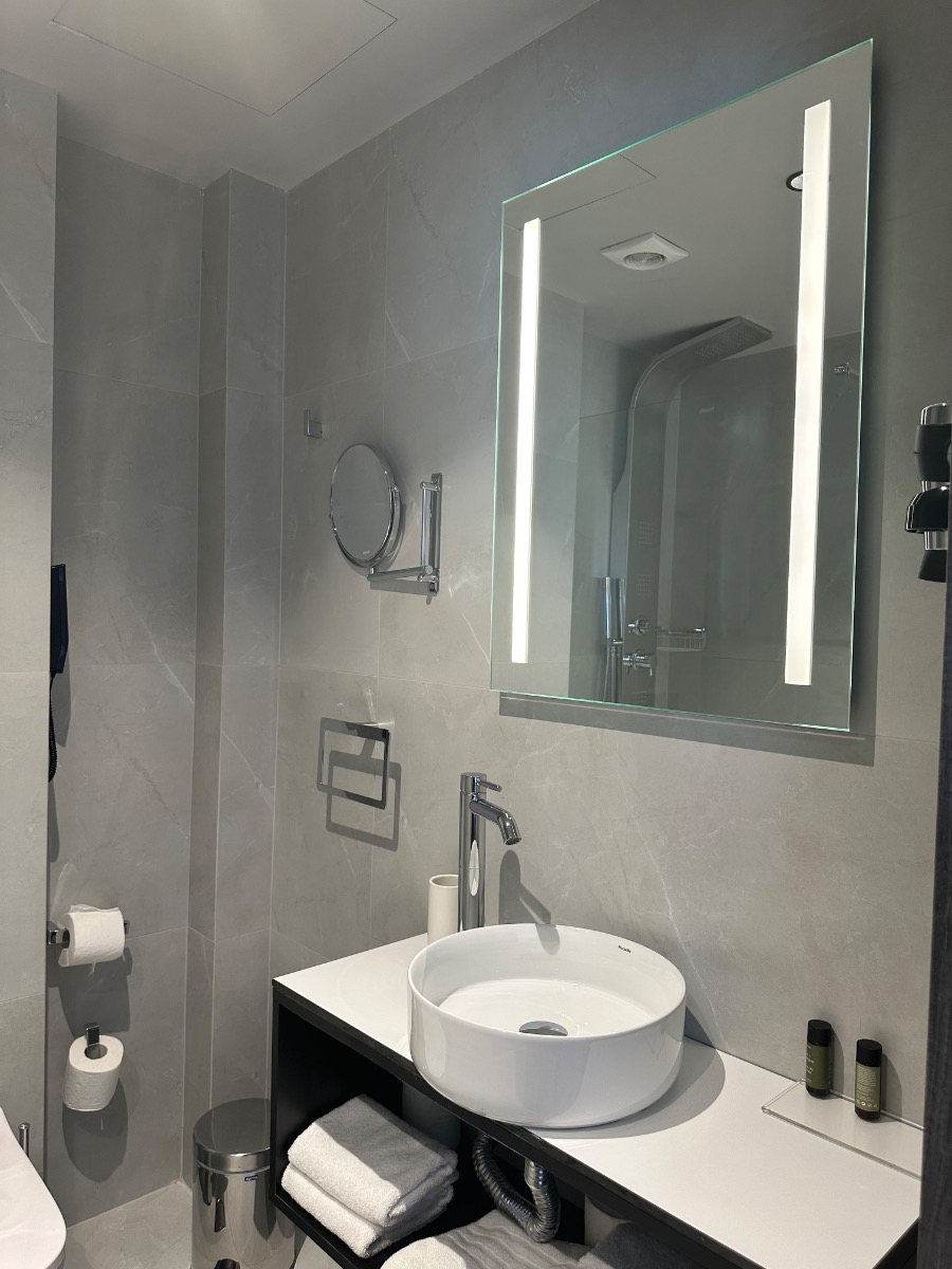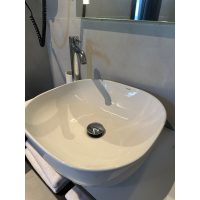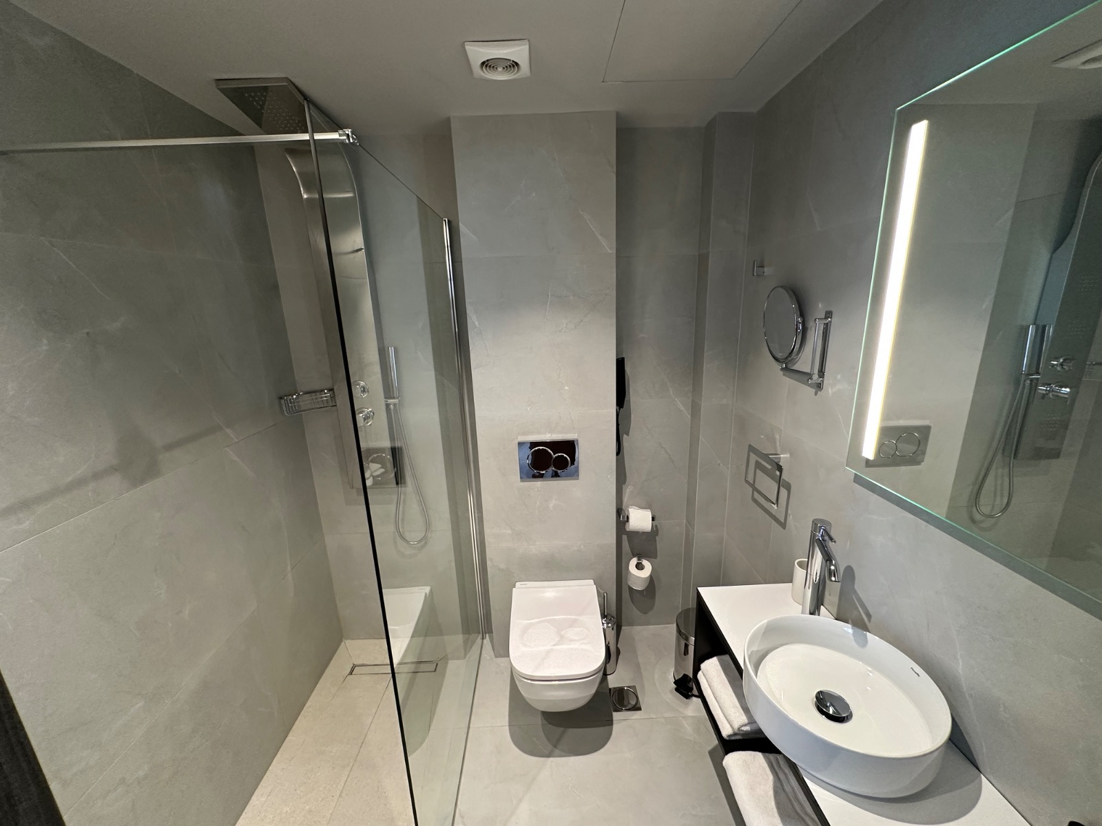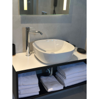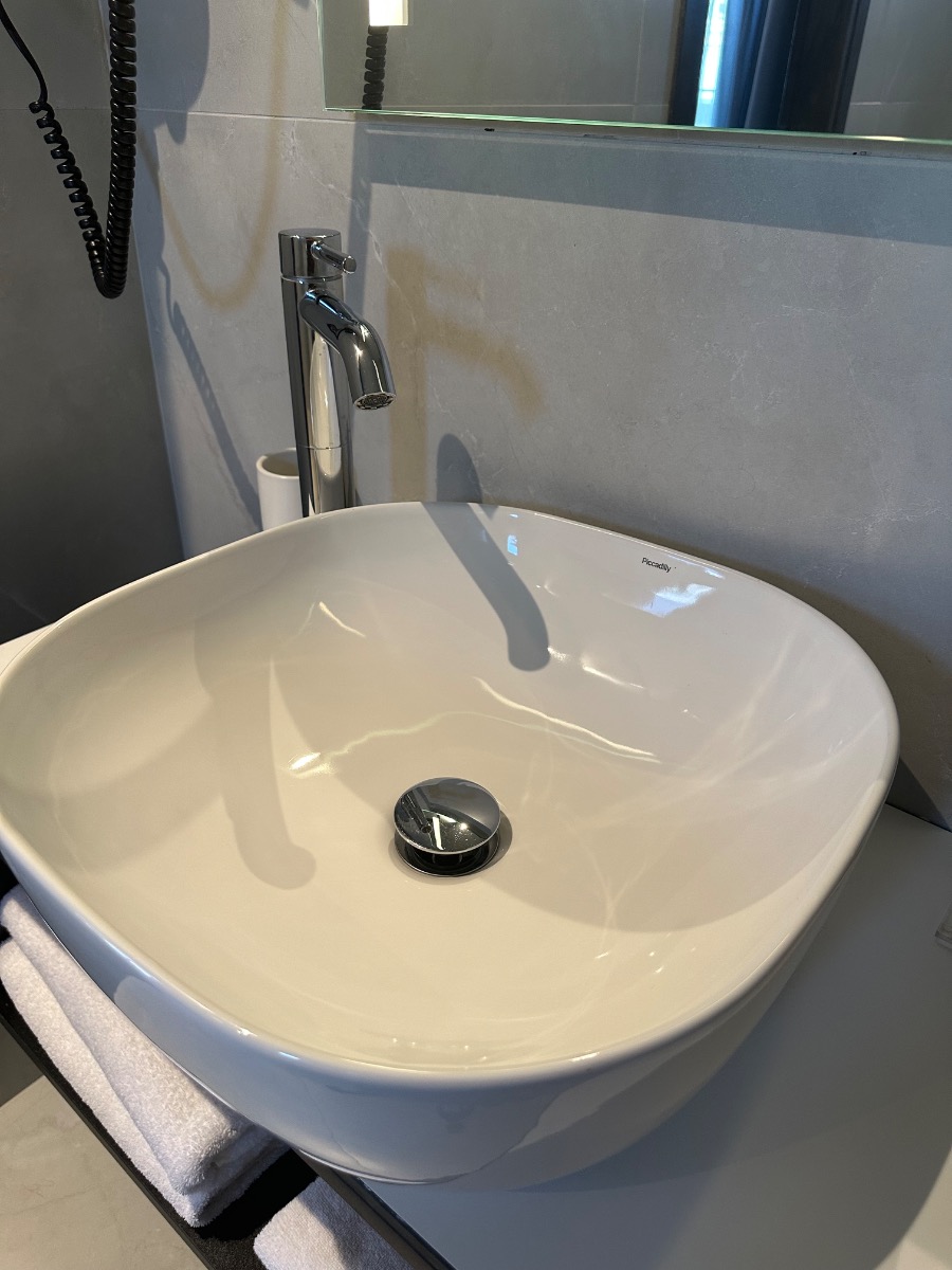 Σε ότι αφορά τα μπάνια των δωματίων του ξενοδοχείου, επιλέχθηκαν ποιοτικά είδη υγιεινής με σκοπό να συνδυάζουν τη διακριτική πολυτέλεια με την αίσθηση καθαρότητάς και ευεξίας, καθώς ακόμα και το μπάνιο ενός ξενοδοχείου αποτελεί αναπόσπαστο μέρος της συνολικής εμπειρίας του πελάτη. Πιο συγκεκριμένα: Νιπτήρες GA-4016B F36 ελεύθερης τοποθέτησης της κορυφαίας εταιρείας Piccadilly αλλά και στρογγυλός GA-2043 (27X33cm) επίσης ελεύθερης τοποθέτησης της ίδιας εταιρείας. Καμπίνες ντουζιέρας 100Χ195cm FA 1021, πάλι από την κορυφαία Piccadilly, οι οποίες είναι κρυστάλλινες και βαρέως τύπου, υψηλής ποιότητας και αντοχής, με 1 σταθερή πόρτα από διάφανο κρύσταλλο. Συνδυάστηκαν με εντοιχιζόμενους αναμίκτες Ceraline Kit της Ideal Standard σε χρωμέ φινίρισμα και με κεφαλή ντουζ (επίσης χρωμέ) Roma F30 Inox της Piccadilly. Της ίδιας εταιρείας (Piccadilly) είναι και οι στήλες ντουζ υδρομασάζ CLAI10 (140X20cm) χρωμέ. Οι εν λόγω στήλες αποτελούν πλήρες σετ με: