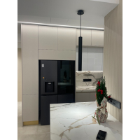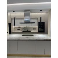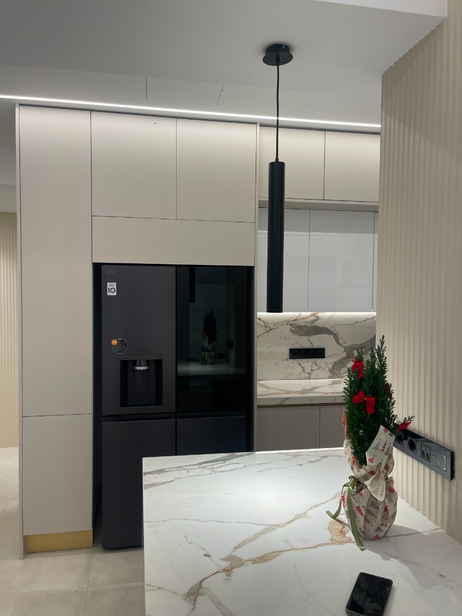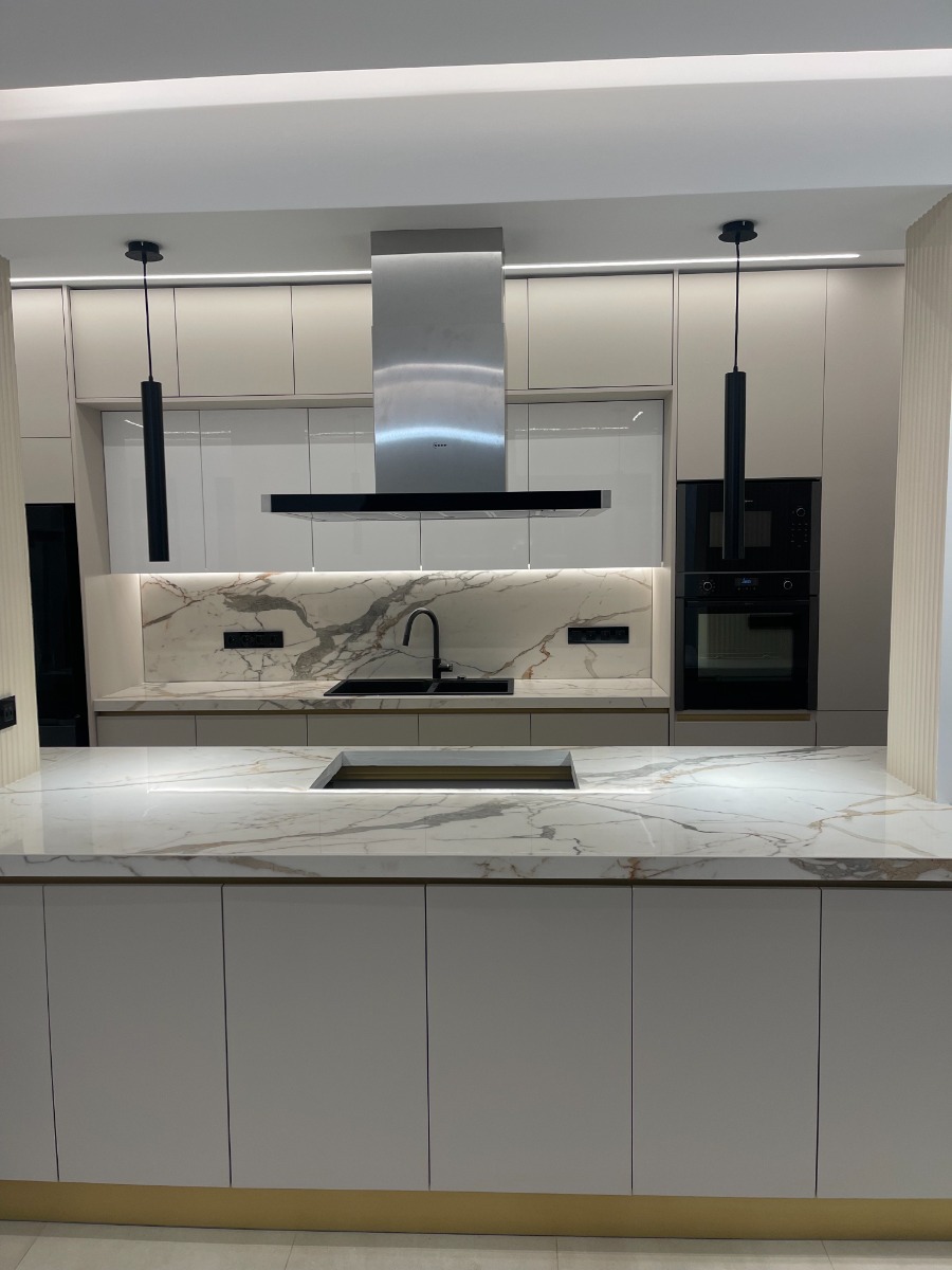 Για τον χώρο της κουζίνας και πιο συγκεκριμένα για τους πάγκους και την νησίδα, επιλέχθηκε το κορυφαίας ποιότητας γρανιτοπλακάκι Ετέρναλ Γκόλντ τύπου slab σε διάσταση 160Χ320cm σε ύφος μαρμάρου, για ένα ενιαίο αισθητικό αποτέλεσμα χωρίς πολλούς αρμούς, το οποίο κλέβει τις εντυπώσεις, και μαγνητίζει τα βλέμματα. Σε ότι αφορά τον νεροχύτη, αυτός είναι ο γρανιτένιος Urban UBG 620 σε διάσταση 86Χ50cm της Franke σε μαύρη εντυπωσιακή απόχρωση Onyx. O νεροχύτης ενσωματώνει 2 γούρνες, αυτόματη βαλβίδα και συνεπίπεδο προφίλ, με το σιφόνι και την βαλβίδα να περιλαμβάνονται στην συσκευασία. Τέλος, για την μπαταρία του νεροχύτη επιλέχθηκε το μοντέλο Line ντουζ IΙ της Franke σε εντυπωσιακή μαύρη απόχρωση Onyx και με περιστρεφόμενο ρουξούνι.