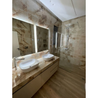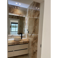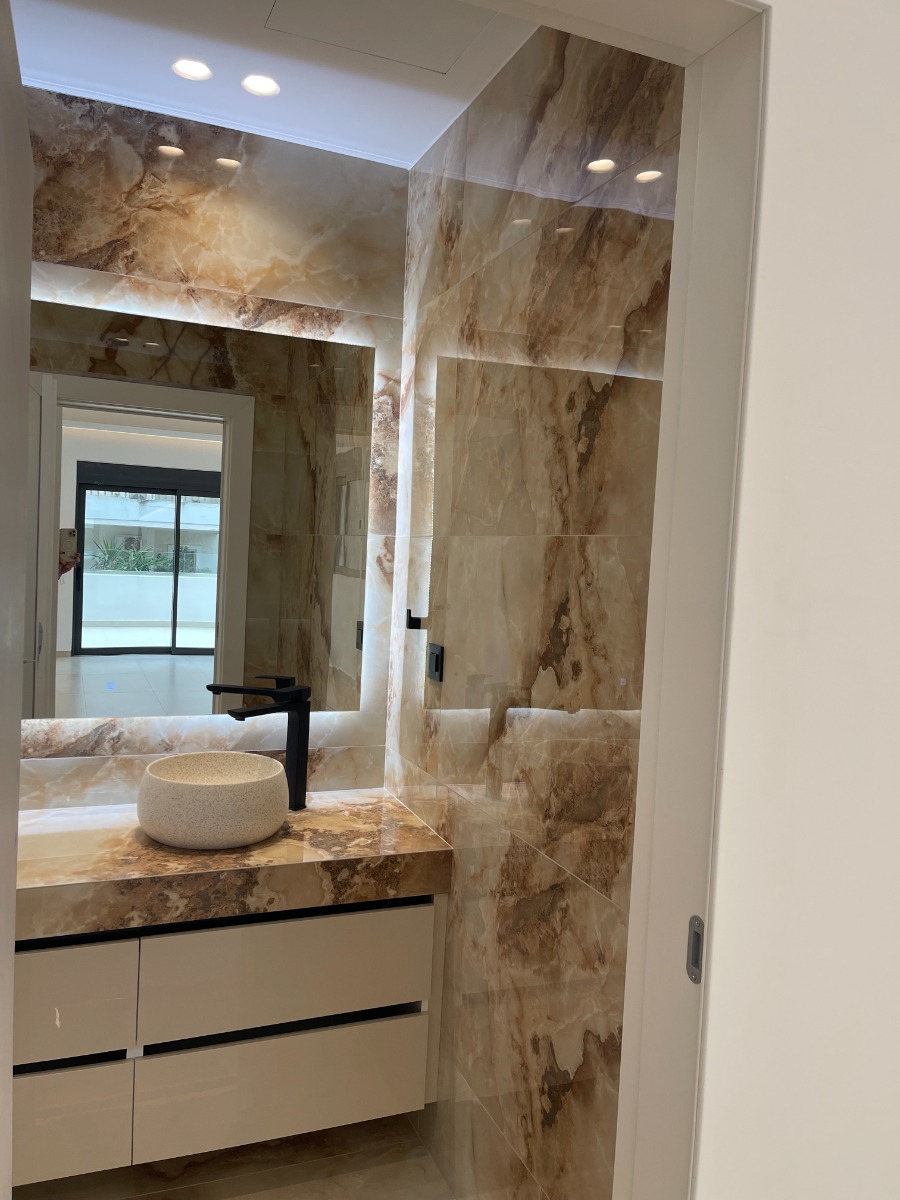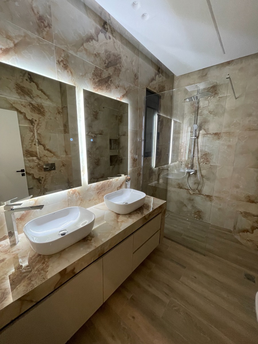 Για τους χώρους των μπάνιων -και συγκεκριμένα για το δάπεδο- επιλέχθηκε πρώτης ποιότητας γρανιτο-πλακάκι Πεκάν Μπεζ σε διάσταση 23,3 Χ120cm σε ύφος ξύλου, που δημιουργεί μία φιλόξενη και ζεστή ατμόσφαιρα στον χώρο. Σε ότι αφορά τους τοίχους των μπάνιων επιλέχθηκε το πρώτης ποιότητας, γυαλιστερό γρανιτο-πλακάκι Φέντα Ονυξ Μπράουν σε διάσταση 60Χ120, τύπου Rectified, για την εύκολη και απρόσκοπτη εφαρμογή τους. Η υφή μαρμάρου των πλακιδίων, προσδίδει διαχρονική κομψότητα στον χώρο, με τα πλακάκια να αναδεικνύουν με απαράμιλλη πιστότητα τις λεπτές φλέβες και το βάθος της απόχρωσης του μαρμάρου.